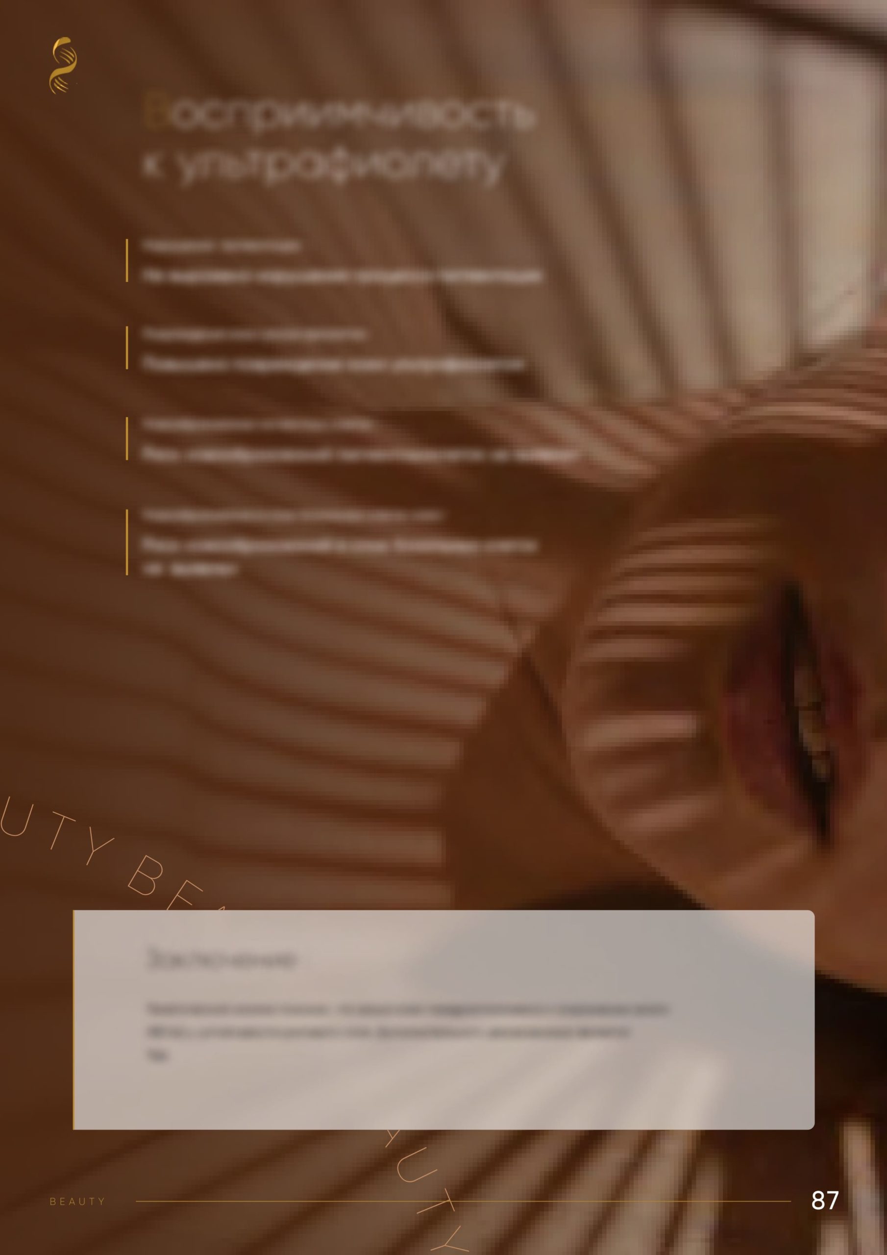- Восприимчивость к ультрафиолету. Нарушение процессов пигментации, защита кожи от ультрафиолета, риск меланомы.