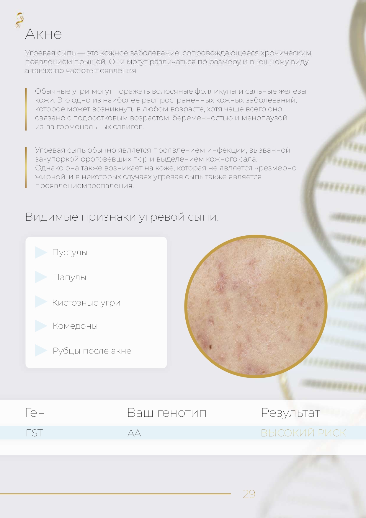 В данном тесте исследуется только предрасположенность к заболеваниям кожи, например, акне.